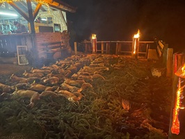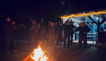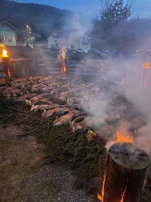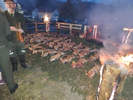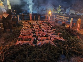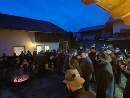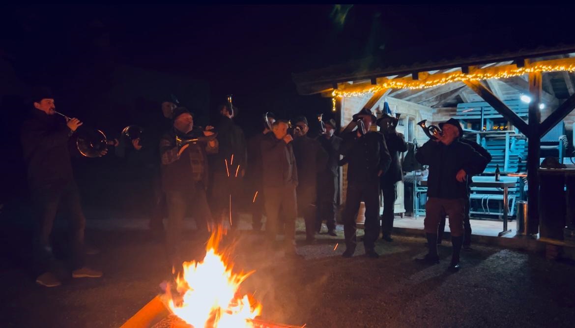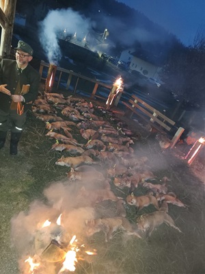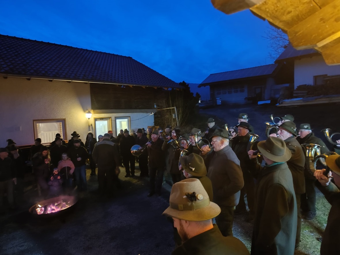 Zum Abschluss mit Strecke Legen und Bruchübergabe trafen sich dann rund 70 Jägerinnen und Jäger im Hof von Gastwirt Franz Loibl in Bernried-Grub – im Schein von Feuerschalen und Schwedenfeuern, das Ganze brauchtumsgerecht umrahmt von den Ulrichsberger Jagdhornbläsern mit Hornmeister Max Rosenlehner und den Perlbachtaler Jagdhornbläsern mit Hornmeister Philipp Altschäffl.