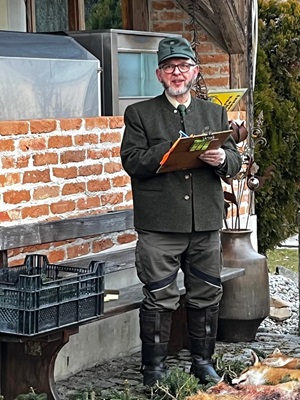 Die HG-Leiter Stefan Höfner (HG 11) und Patrick Schneid (HG 12) übergaben die Erlegerbrüche. Anschließend wurde die Strecke von den Jagdhornbläsern mit den Signalen „Fuchs tot“, „Flugwild tot“ und dem Hubertusmarsch verblasen.